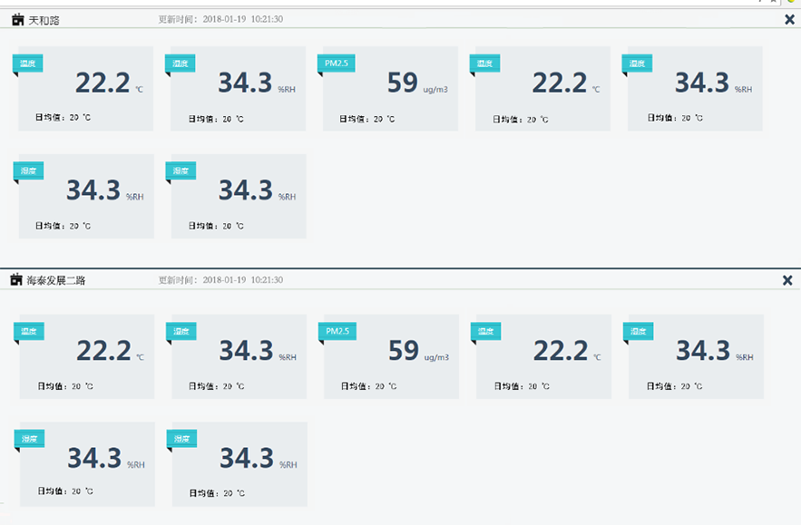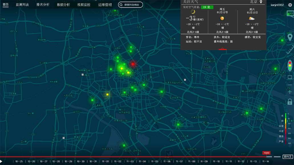1. 當(dāng)前為各個(gè)點(diǎn)位的PM2.5或者PM10整體分布??梢钥吹礁鱾€(gè)檢測點(diǎn)位的相對位置,可以通過放大或者縮小查看點(diǎn)位的具體分布情況。