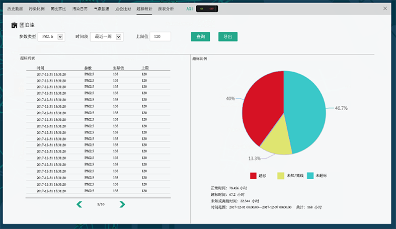 可以對特定的點(diǎn)位按選定的時(shí)間段進(jìn)行超標(biāo)統(tǒng)計(jì),以表和圖兩種方式同時(shí)顯示。通過圖可以直觀地看到超標(biāo)的情況,通過表可以詳細(xì)查看什么時(shí)間出現(xiàn)的超標(biāo)。