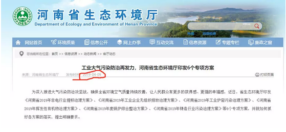 2019年4月9日,河南省生態(tài)環(huán)境廳印發(fā)《河南省2019年非電行業(yè)提標(biāo)治理方案》、《河南省2019年工業(yè)企業(yè)無組織排放治理方案》、《河南省2019年工業(yè)爐窯污染治理方案》、《河南省2019年揮發(fā)性有機(jī)物治理方案》、《河南省2019年度鍋爐綜合整治方案》、《河南省2019年鑄造行業(yè)污染治理方案》等6個(gè)專項(xiàng)方案。
