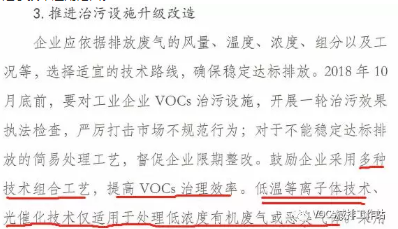 1)如2018年10月23日山西呂梁環(huán)保局發(fā)布“《呂梁市VOCs綜合治理專項(xiàng)行動(dòng)方案》”,其中提及“低溫等離子技術(shù)、光催化技術(shù)僅適用于處理低濃度有機(jī)廢氣或惡臭氣體”,界定了技術(shù)適用范圍。