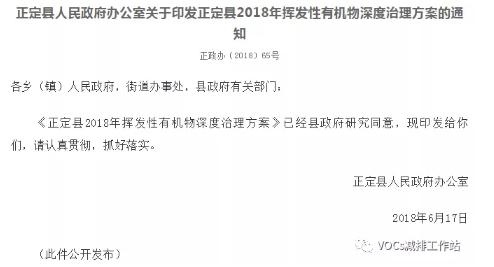 7)2018年6月,河北正定縣人民政府發(fā)布正定縣2018年揮發(fā)性有機(jī)物深度治理方案的通知。