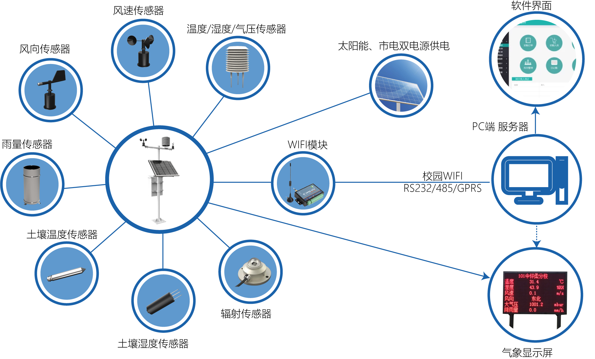 實(shí)時(shí)監(jiān)測風(fēng)速、風(fēng)向、雨量、溫度、濕度、氣壓、光照度、土壤溫度、土壤濕度等九要素氣象參數(shù)